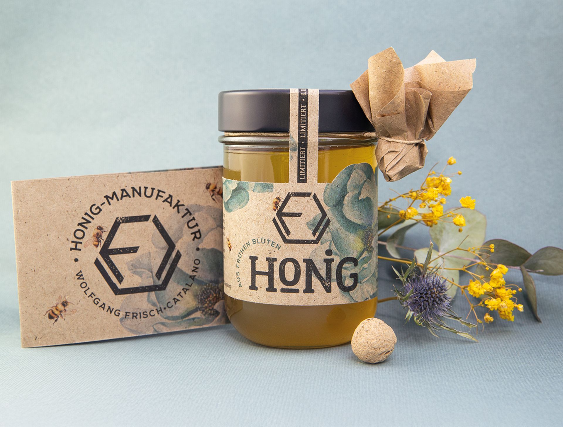 Das wabenförmige Logo mit den Initialen W-F-C des Imkers Wolfgang Frisch-Catalano und die kreisförmige Typografie symbolisieren den geschlossenen Kreislauf der Imkerei. Ein Limitiert-Band über dem Originalitätsverschluss hebt die Exklusivität und den Ursprung aus eigener Imkerei hervor.